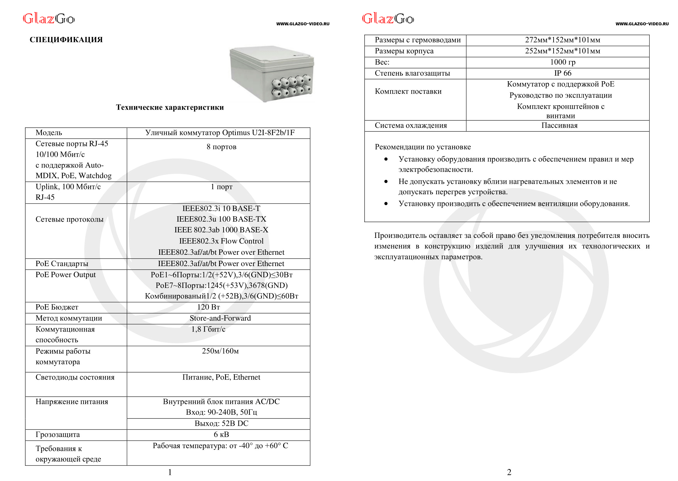 Optimus U2I-8F2b/1F – это неуправляемый коммутатор, разработанный специально для создания надежной и стабильной сети видеонаблюдения. Он предлагает оптимальное сочетание функциональности, производительности и простоты использования, что делает его отличным выбором как для небольших, так и для средних систем.
