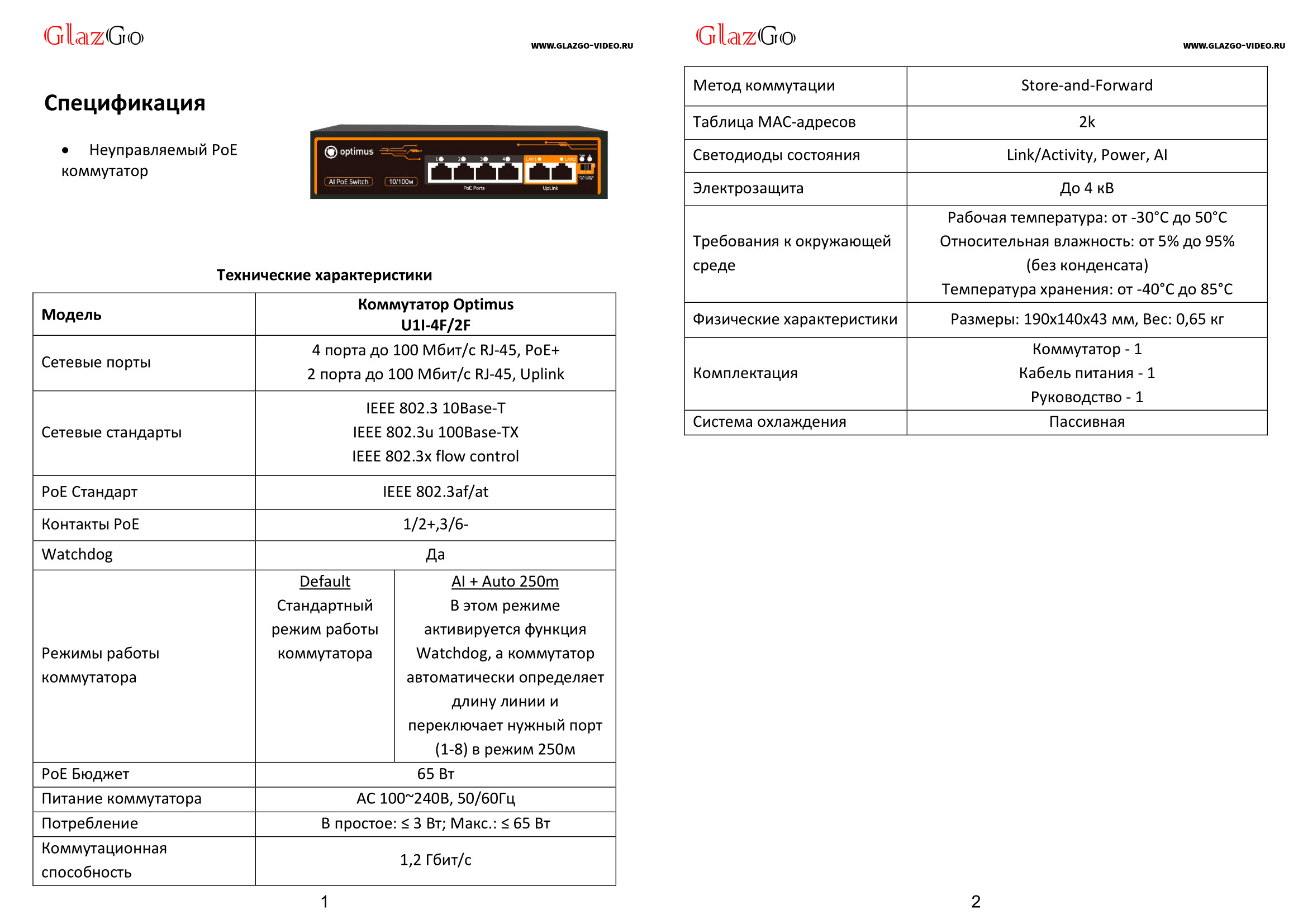 Краткое описание коммутатора для видеонаблюдения Optimus U1I-4F/2F
