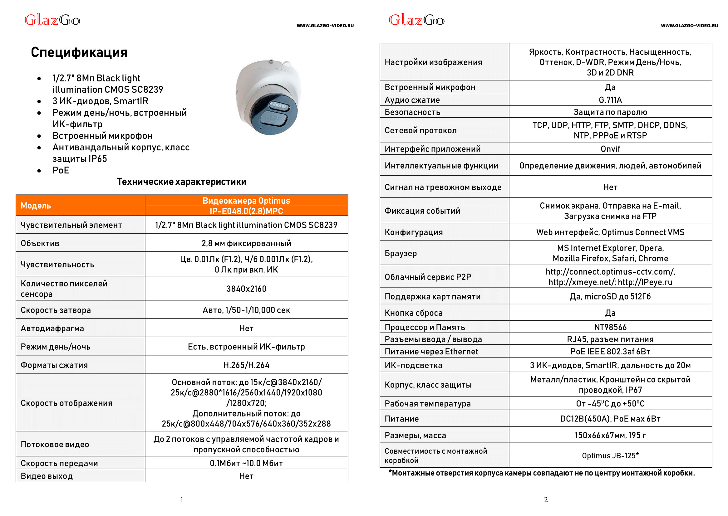 Краткое описание видеокамеры Optimus IP-E048.0(2.8)MPC