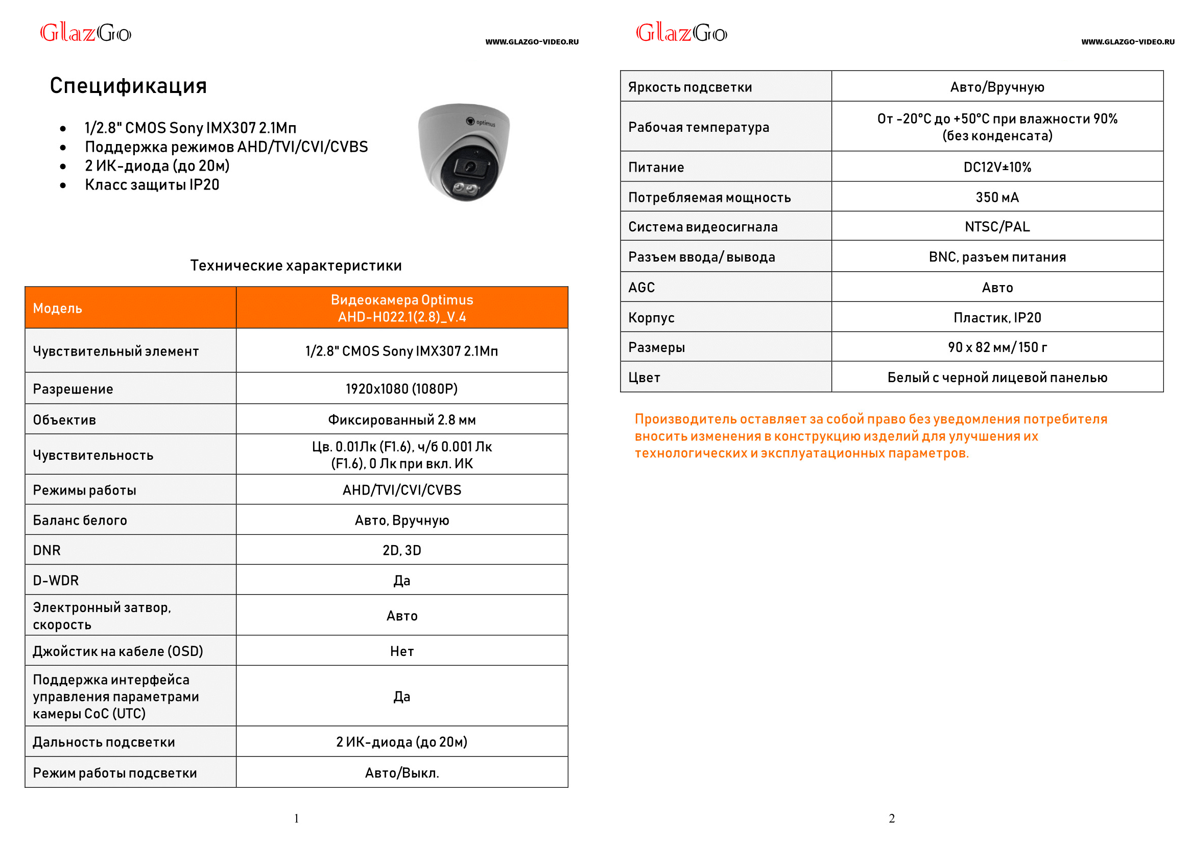 С Optimus AHD-H022.1(2.8)_V.4 вы можете быть уверены, что ваш объект под надежной защитой!
